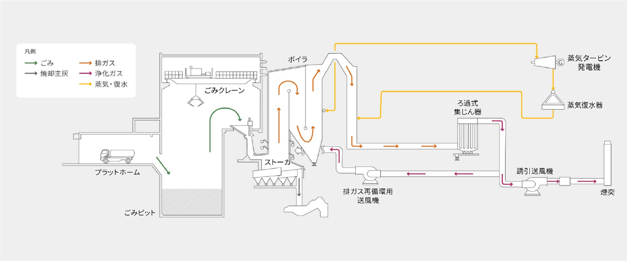 一般家庭からのごみを焼却処理し、減容化、無害化、安定化するとともに、焼却熱を発電などに有効活用する施設です。AIやさまざまな技術を導入し、より効率的な処理を実現しています。